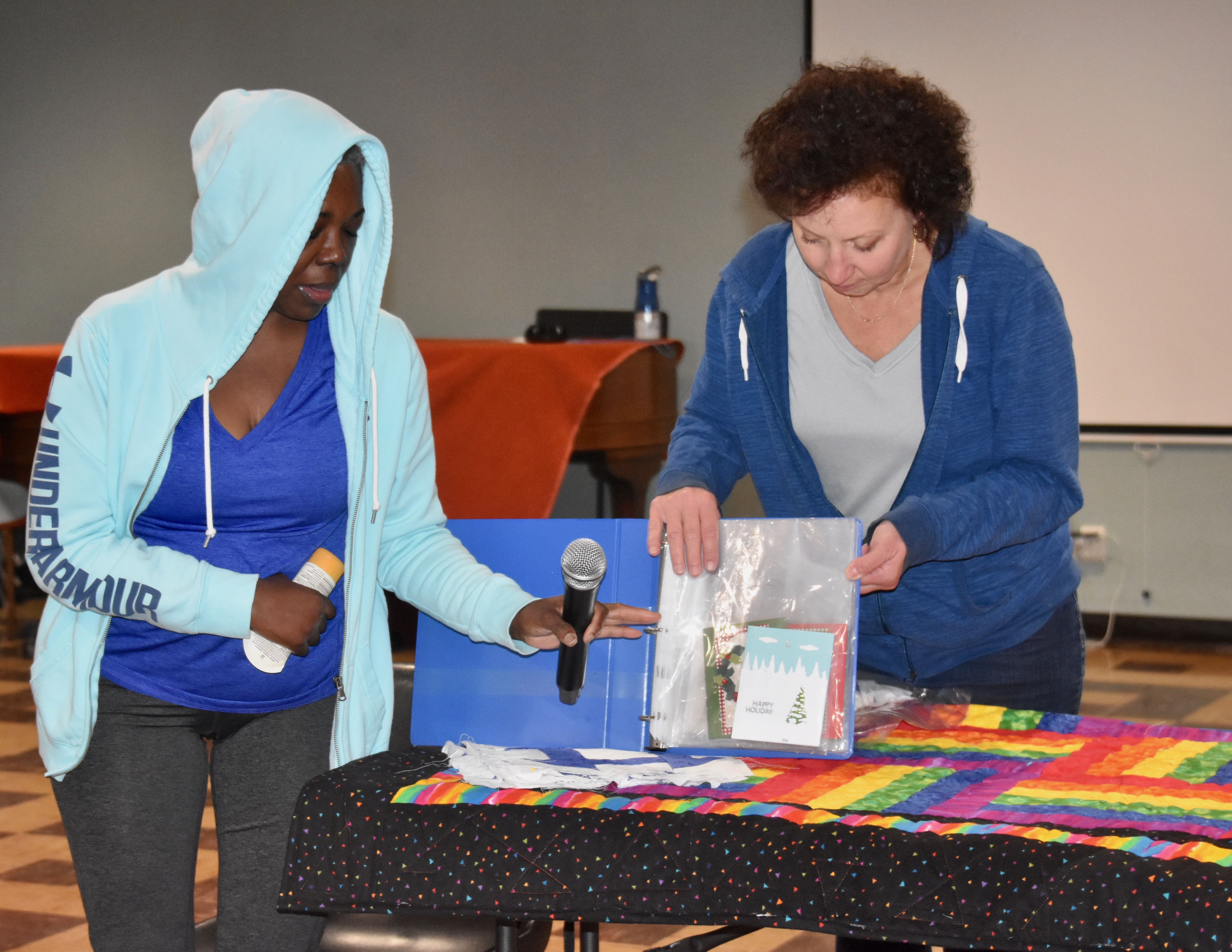 Sabrina Simmons shows her handmade cards and quilt